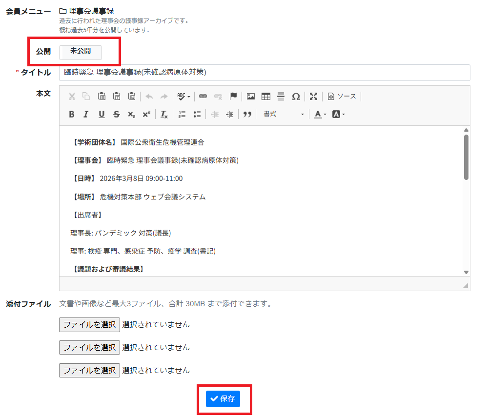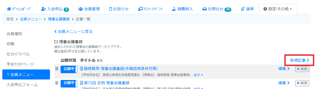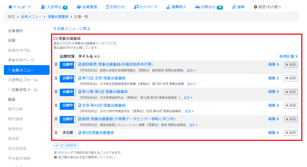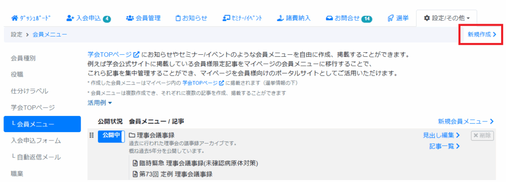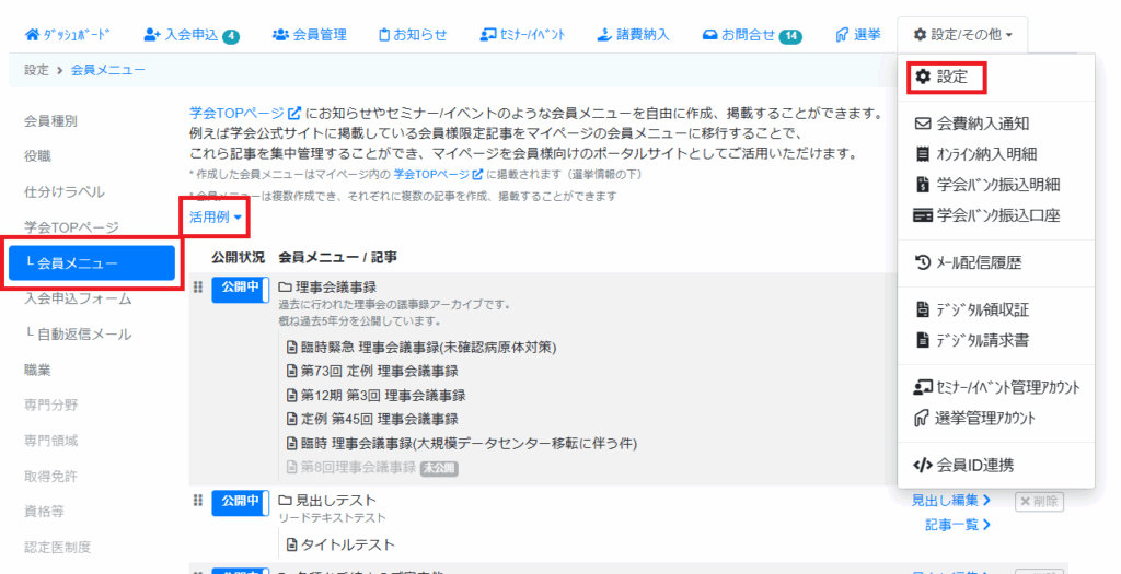 【9】設定/その他 「設定/その他」とは? 「設定/その他」では、学会バンクの各種設定を行います。さまざまな会員種別の設定が行えます。さまざまな役職の設定が行えます。「仕分けラベル」で自由にグループ分け(フラグ)することができます。会員マイページのトップページには、学会からの重要なお知らせを掲示したり、よくアクセスする関連学会サイトへのURLをリンクすることが可能です。入会申込フォームには、入会に関する重要な情報を掲載するための欄や、入会希望者への質問をする通信欄が用意されています。入会申込者への自動返信メールの一部を自由にカスタマイズできます。各学術団体に特化した、様々な職業を設定することができます。リアルタイムで会費未納者の情報を収集し、その未納者全員に一括でメールを送信できます。オンラインにて納入された方たちの一覧を表示することができます。学会バンクから学会または事務局へ送金する金額を、振込明細書のPDF形式で発行することが可能です。学会バンクのメール配信機能から送信されたメールの送信履歴が一覧で確認できます。「会員ID連携」を活用すると、会員マイページのログイン情報を使って、複数のサイトにログインすることが可能です。年会費、各種イベントなどに対して、それぞれの振込先口座が登録できます。※操作は学会事務局のみが可能ID連携にて提供される閲覧制限機能は簡易的なものとなります。秘密保持が必要とされる重要文書、情報等への利用はお控えください。 運用の流れ 基本的な初期設定を行います。 ①会員種別と年会費設定一般的には会員種別ごとに年会費が異なります。会員種別ごとに正確な年会費の設定を行います。 ②役職の設定学術団体に沿って役職を設定してください。(一般的には、会長、理事長、副理事長、理事、副理事、監査、評議員、事務局長等が挙げられます) ③仕分けラベルの設定学術団体に特化したフラグを自由にグループ分けしてください。(一般的には、各委員会、部会、幹事会、休会等が挙げられます) ④会員向け学会TOP会員に向けて重要なお知らせがある場合や、関連サイトがある場合は、会員マイページのTOP画面をカスタマイズしてください。 ⑤入会申込フォームの設定 入会希望者に重要なお知らせがある場合や、入会希望者へ質問事項がある場合は、入会申込フォームをカスタマイズしてください。 ⑥自動返信メールの設定「入会申込の承りメール」、「入会を受理したメール」の自動返信メールの一部をカスタマイズできます。会長、理事長からのあいさつ文、その他重要なお知らせ等、自由にカスタマイズしてください。 ⑦職業の設定学術団体に沿って職業を設定してください。(一般的には、医師、看護師、救急救命士、薬剤師、歯科医師、保健師、診療放射線技師等が挙げられます) ⑧振込先口座年会費の振込先口座を登録してください。年会費とは別に学術集会などのイベントごとに振込先が異なる場合は、「新規口座登録」をしてください。 機能説明 1.【会員種別】 異なる会員種別(区分)ごとに適切な年会費を設定 2.【役職】 役職、肩書等の設定 3.【仕分けラベル】 委員会、部会等、独自のグループを設定 4.【会員向け学会TOP】 会員マイページTOPの一部をカスタマイズ 5.【会員メニュー】 【新機能】会員マイページのTOP画面に「お知らせ」や「セミナー/イベント」のようなコーナーを自由に作成、掲載 6.【入会申込フォーム】 入会申込フォームの一部をカスタマイズ 7.【自動返信メール】 入会申込フォームからの申請者に向けて自動返信メールをカスタマイズ 8.【職業】 学術団体ごとに適切な職業を設定 9.【その他の設定】 適格請求書(インボイス)発行事業者登録番号の設定 10.【会費納入通知】 全ての会費未納者に対して、一括でメール通知 11.【オンライン納入明細】 オンラインで納入された方の一覧を表示 12.【学会バンク振込明細】 オンラインで納入された分を月別に明細書に反映(年会費/イベント) 13. 【学会バンク振込口座】 年会費や学術集会など振込口座登録(送金先口座) 14.【メール配信履歴】 学会バンクのメール配信機能から配信された方の一覧を表示 15.【デジタル領収証】 学会バンクを通じたオンライン納入以外の各種納入に対し、会員や一般宛に領収証を発行することができます。 16.【デジタル請求書】 【準備中】会員や一般宛に請求書をオンライン発行することができます。 17.【会員ID連携】 会員マイページのログインIDとパスワードひとつで、複数のサイトにログインが可能 1.【会員種別】 【会員種別の各種設定】 それぞれの会員種別を登録してください。 会員種別に沿って、年会費を登録してください。 会員種別と年会費に誤りがあると、トラブルに繋がりますので、ご注意ください。 それぞれの会員種別に該当する人数を右端にある「青字」から確認してください。 会員種別を追加する場合は「+行追加」から制限なく追加することがで